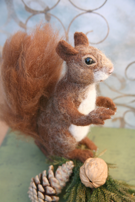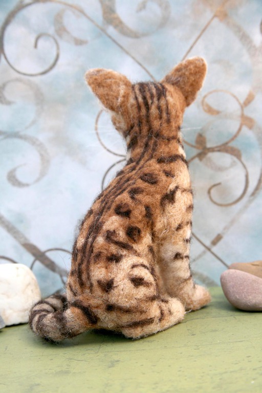 Er hat eine stattliche Länge von 38 cm. Seine bernsteinfarbenen Glasaugen sind 16 mm groß. Normalerweise beträgt die Höhe des von mir gefilzten Tieres ca. um die 15 cm. In dieser Größe kann man die Figuren anschaulich ins Regal oder auf den Schreibtisch stellen.